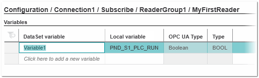 Since the configuration of publishers and the subscribers takes place in different projects, there can be no automatic check for these rules. When configuring the reader, you must ensure that the necessary information on the values contained in the subscribed data set is available and considered.According to the defined mapping, the reader will receive the values contained in the specified data set in the defined publishing interval from all writers specified by the Publisher ID and Writer group ID.You can change the order of the inserted variables by dragging & dropping them within the table: Click on an entry in the row header and hold down the mouse button while moving the mouse.- In the 'Variables' table on the right, click into the empty 'DataSet variable' field.