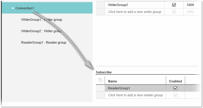 The properties of reader groups can be displayed and edited in the 'Subscribe' table (table of the 'Connection' node).