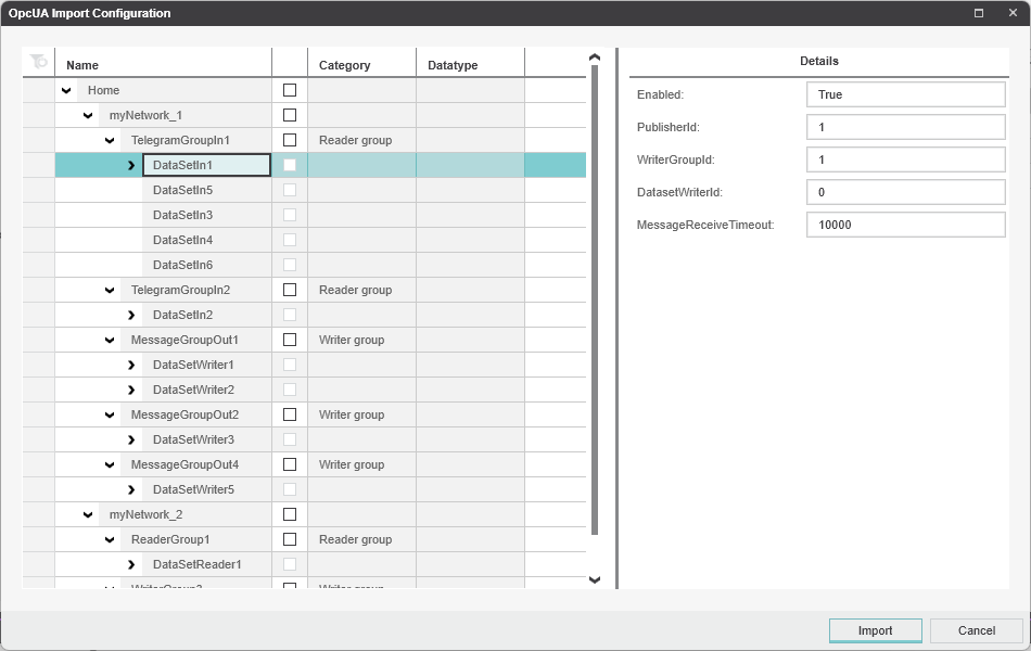 The 'Details' area on the right displays information about the node selected on the left. Unsupported nodes such as readers or writers or, for example, a server variable with an unsupported data type, are marked as faulty (the corresponding tooltip shows the error). - In the dialog, select the connections and/or the reader/writer groups to be imported. If you select a connection, all children nodes (reader and writer groups, readers/writers, variables, etc.) are checked and imported. If you select a single reader or writer group, the parent connection node is automatically checked.Only reader and writer groups can be selected. Selecting individual readers, writers, or variables is not possible (see the note at the beginning of the topic).
